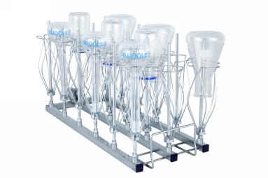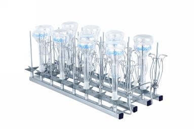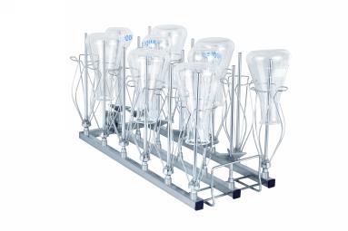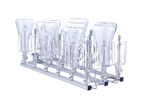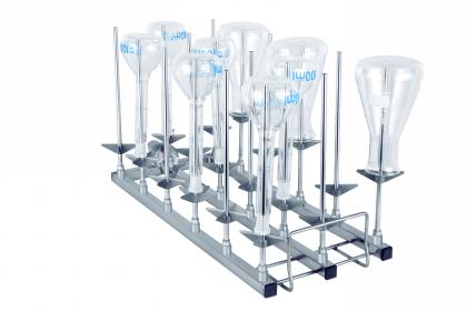 Module A306X3 3×6 (150 mm) • Convient à la verrerie de laboratoire telle que les fioles jaugées, les fioles Erlenmeyer, les fioles à fond rond, la fiole Schott, l'éprouvette graduée, etc. • 9 × buses d'injecteur S601506A (H 150 mm) • 9 × buses d'injecteur S601508C (H 150 mm) • H 183, L 184, P 472 mm |